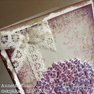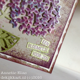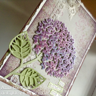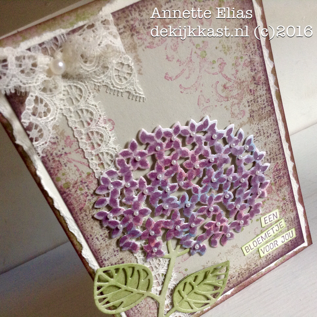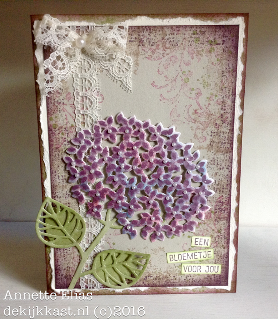 Inspiratie is overal.....De kleuren voor dit kaartje zijn simpelweg nagemaakt van de hortensias in onze eigen tuin. Ik weet niet hoe anderen daar over denken, maar ik vind deze bloemen vaak op z'n mooist als ze een beetje beginnen te verkleuren. Áan het eind van hun bloei dus....Dan krijg je van die mooie kleurschakeringen....Perfect voor een Vintage-effect! Dit was vandaag dan ook mijn uitgangspunt! Mijn d-INKT!-sdagtechniekje heb ik deze keer dan ook op de bloem toegepast.