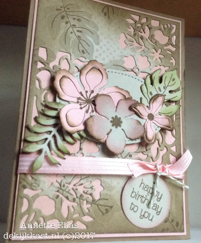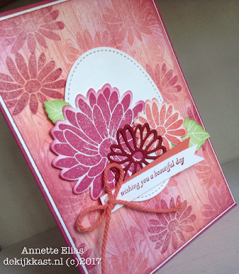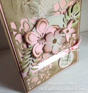 Maar ook de achtergrond draagt bij tot het effect. Hier heb ik de Detailed Floral Thinlits eens op een een andere manier gebruikt waardoor de achtergrond spannend en gelaagd wordt. Helemaal niet moeilijk om te doen, maar met een groots effect. Het geeft ook lekker veel structuur, zoals je op onderstaande foto goed ziet....