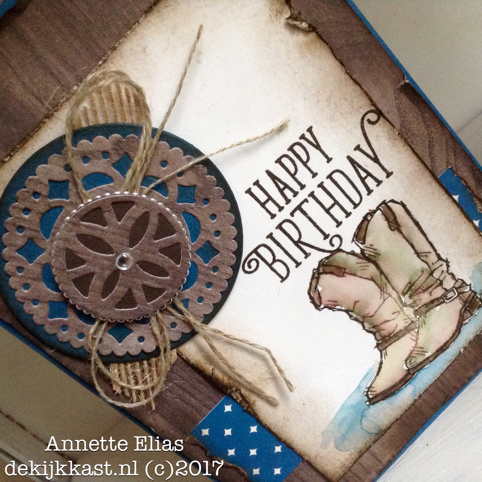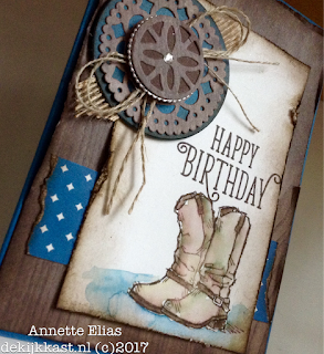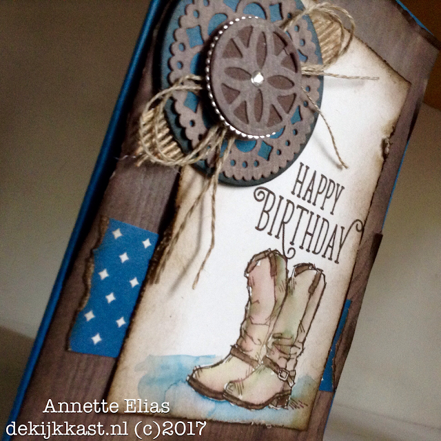 Natuurlijk heb ik de rest van de kaart ook in westernsfeer gehouden. De stoere cowboyboots-stempel  komt uit de set Country Livin' , deze set  staat in de huidige jaarcatalogus en blijft gelukkig ook het komende jaar in de collectie!