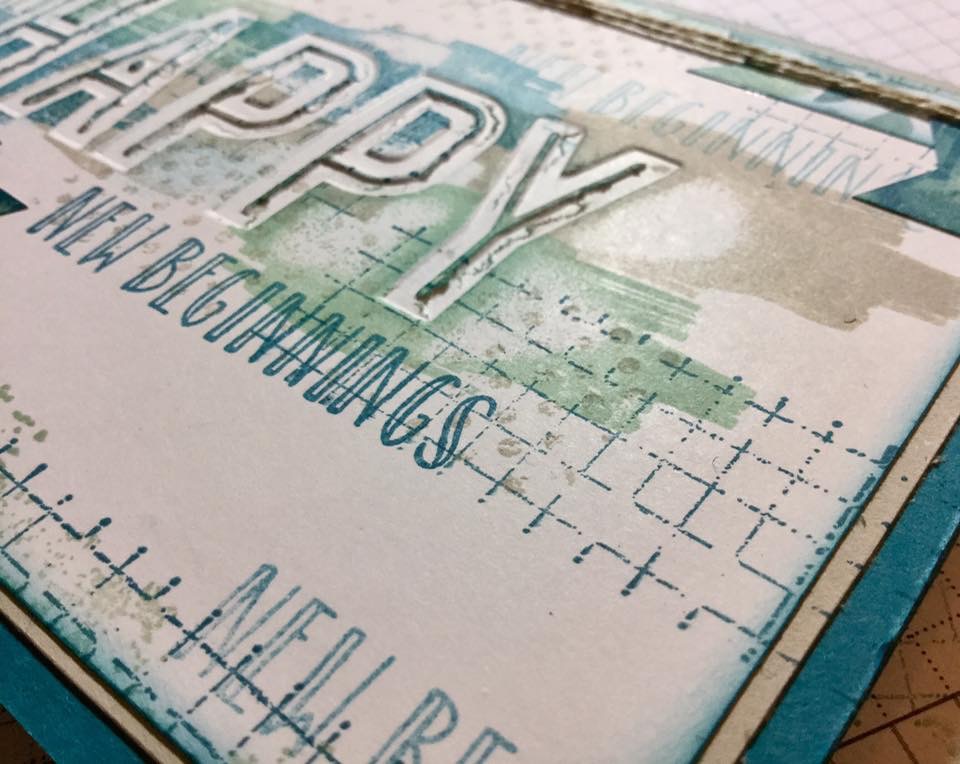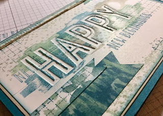Ik begon echter niet met stempelen maar met het debossen van de grote tekst "Happy" Dit deed ik met een van de twee speciale embossingfolders uit de leuke set Celebrations Duo. Als je deze gebruikt komen de letters niet omhoog, maar worden ze in de diepte in het papier gedrukt, dus geen EMbossen, maar DEbossen. Als je er dan overheen gaat stempelen, blijven de dieper gelegen onderdelen blanco en dat steekt dan lekker af. Dit geeft zo'n leuk effect!