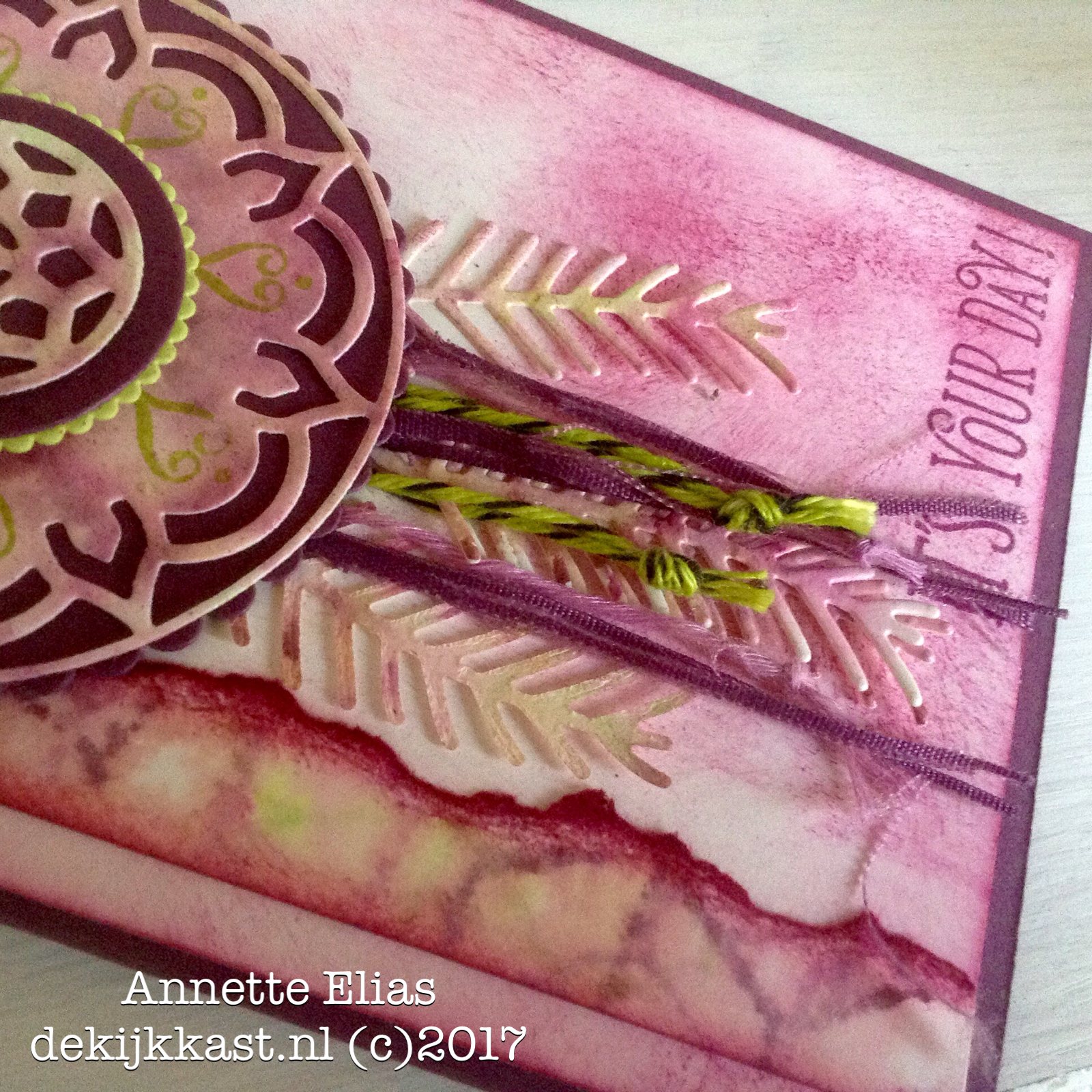 De basis waarmee ik begon was het zelfgemaakte achtergrondpapier waaruit ik de rozetten stanste met de Eastern Medallion Thinlits Dies. Ik had dit achtergrondpapier gemaakt uit 1 stukje watercolorpapier, de Eastern Beauty stempels, vier kleurtjes inkt, en water. Door heel zuinig te doen en met het nodige passen en meten kon ik net alle onderdelen er uit halen. Ook de strook op de achtergrond, en de veertjes maakte ik er van.
