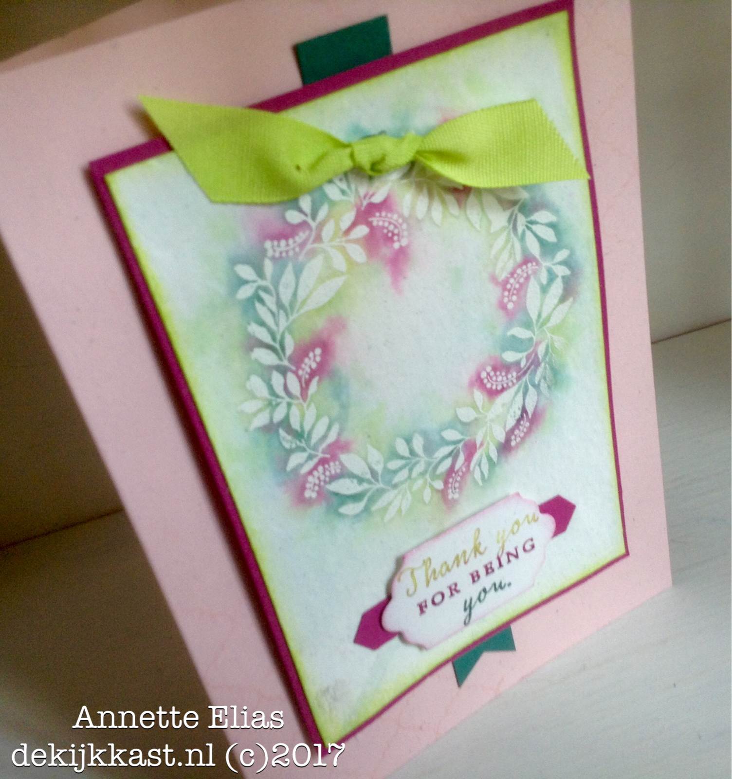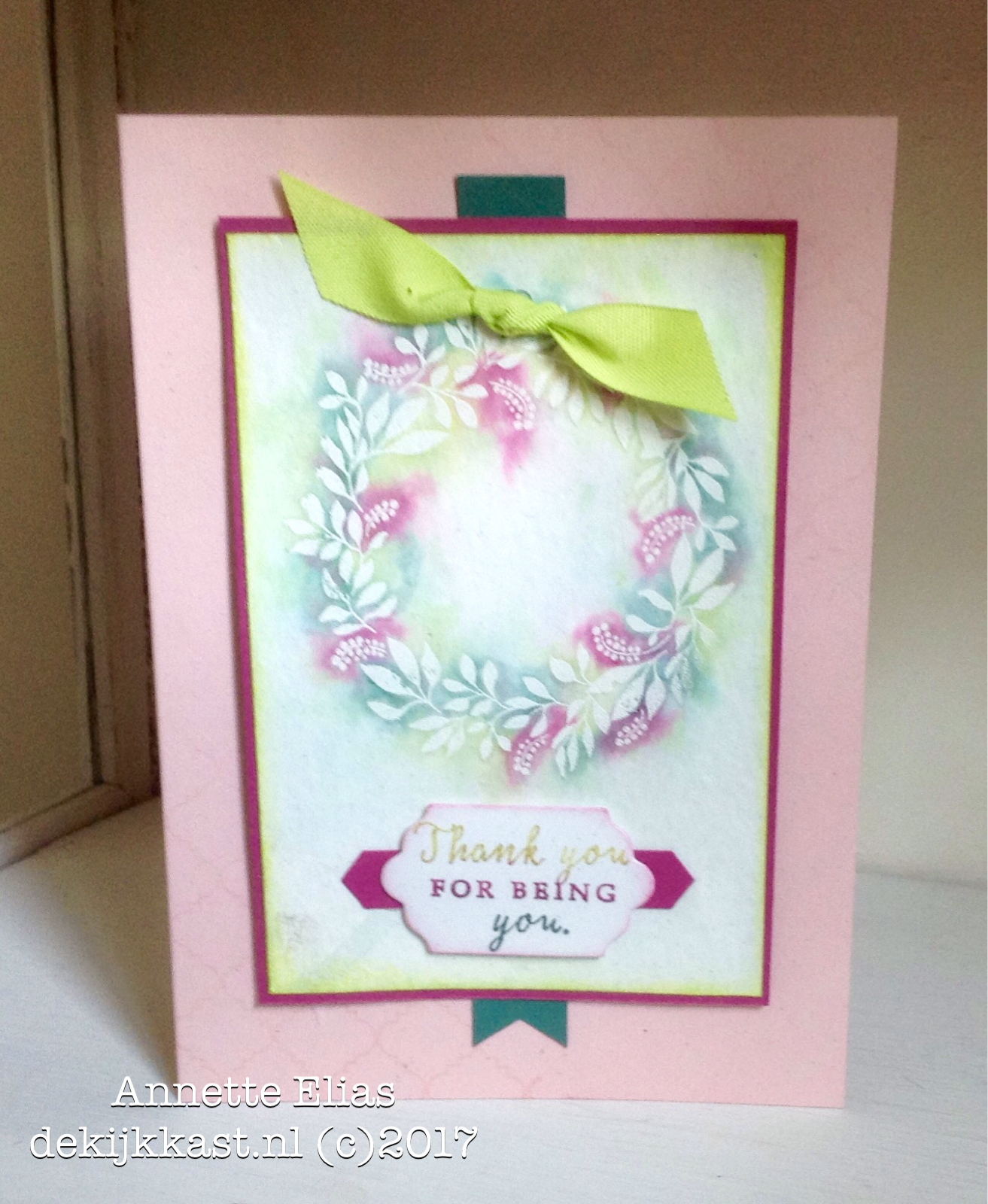 In de diverse laagjes en het lint komen de gebruikte kleuren ook weer terug. Dat alles zo mooi matcht blijft genieten en is een van de vele redenen waarom ik zo graag met Stampin'Up! werk!