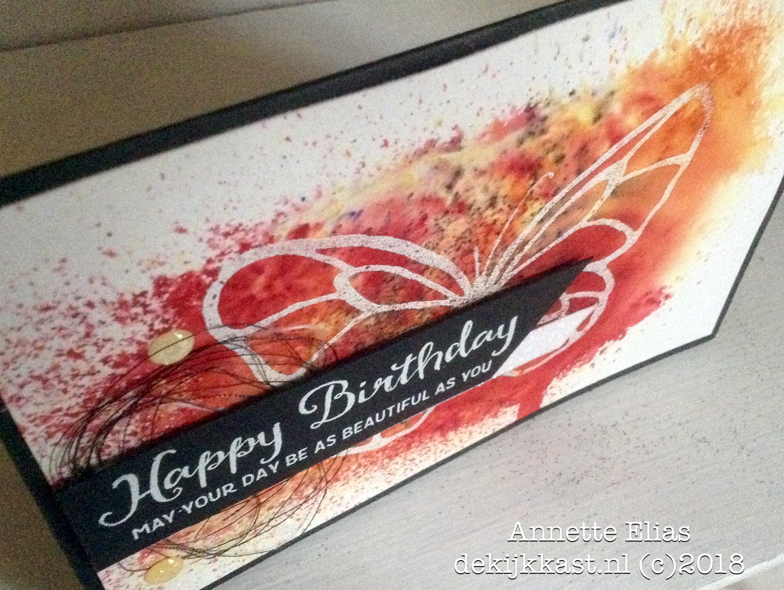 Hier heb ik de stempel geembost met Whisper White embossingpoeder en de heattool, het papier daarna licht vochtig gemaakt, de Brushokristallen toegevoegd en dit nog iets meer vochtig gemaakt, tot ik tevreden was. Gewoon een beetje kliederen dus eigenlijk ;o) Bij deze kaart heb ik vooral de rood, oranje en geeltinten gebruikt. Op het geenboste deel hecht de kleur niet of nauwelijks ("resist") en dat geeft dit gave resultaat.